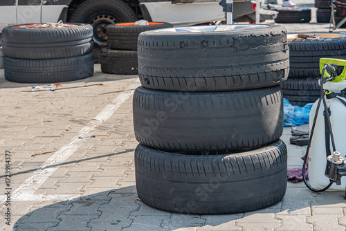 Five black car tires tightly packed, treads facing outward, on concrete tiles orange cone lying beside white sign on top of cone blurred vehicle in background Outdoor parking or maintenance area
