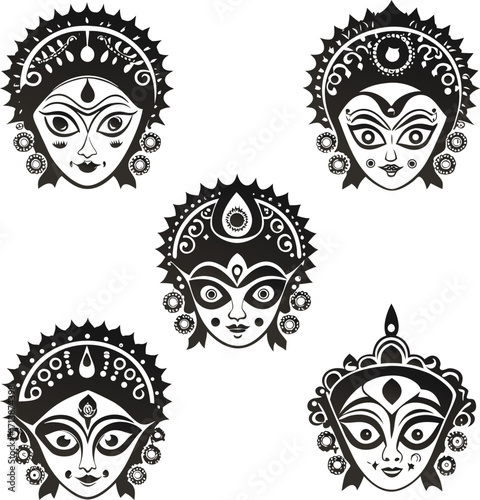 Five Black Hindu Goddess Faces Decorative Vector Art