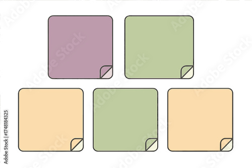 Five blank square sticky notes with rounded corners and folded edges in pastel colors on a white background
