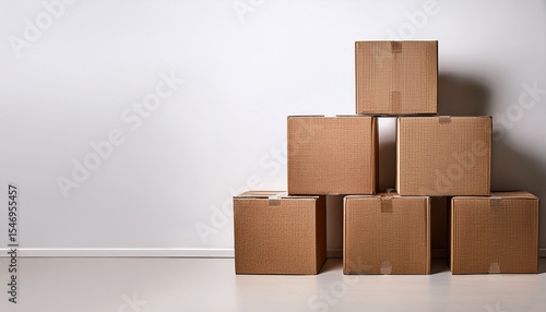 five brown cardboard boxes are stacked in the corner against a plain white background