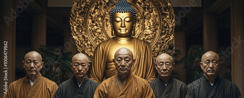 Five Buddhist Monks Praying in Front of a Golden Buddha Statue