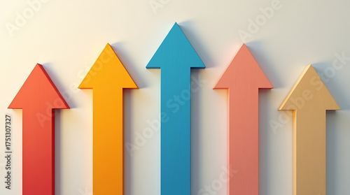 Five colorful arrows pointing upwards on a white surface, growth concept