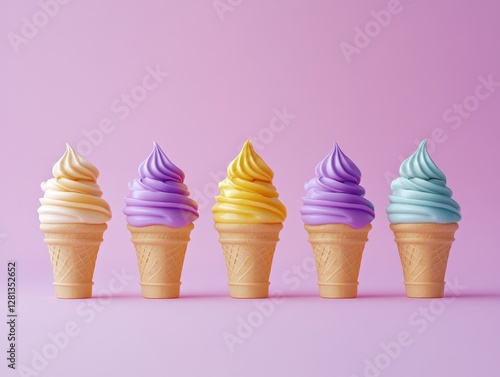 Five colorful ice cream cones in a row against a pastel pink background creating a sweet and playful mood perfect for summer treats