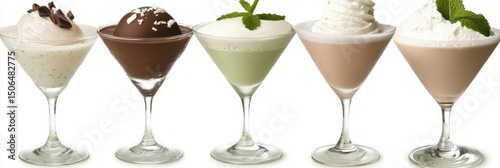 Five creamy dessert drinks in martini glasses; chocolate, vanilla, mint, and two coffee-colored options, garnished with whipped cream and mint