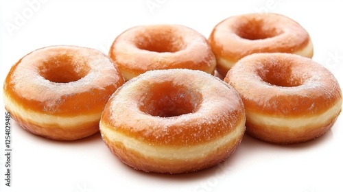 Five delectable donuts glisten under soft lighting, showcasing their golden-brown glaze and fluffy texture. Perfect for dessert lovers exploring sweet treats