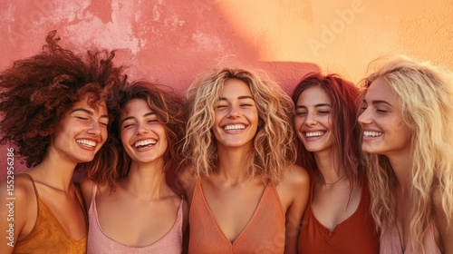 Five friends are joyfully smiling together in front of a peach-colored wall, radiating happiness and warmth, showcasing the strength of friendship and shared moments.