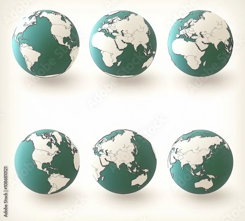 Five Globes Displaying World Map with Green Ocean and White Landmass, Ideal for Global Education, Geography, Travel, and Environmental Themes in Visual Media