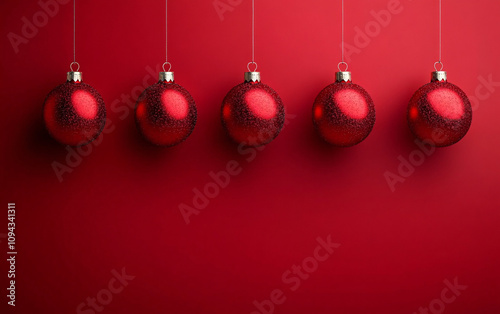 Five glossy red ornaments suspended against a vibrant red wall, perfect for modern holiday cards, festive decorations, and Christmas celebrations with copy space.