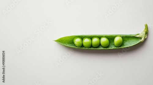 Five green peas inside a pea pod on a white background.