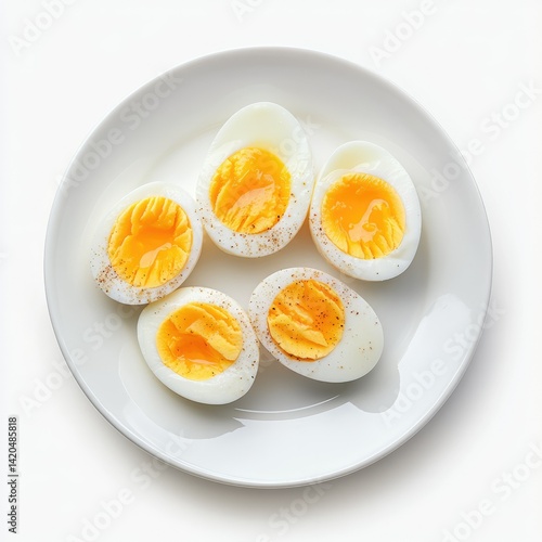 Five halved hard boiled eggs seasoned on a white plate top down view