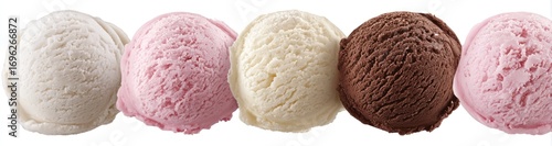 Five ice cream scoops, various flavors in a row, vanilla, strawberry, chocolate, on a white background