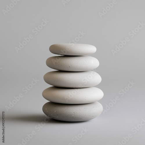 Five light-grey stones are meticulously stacked on a solid grey background. The stones are smooth,