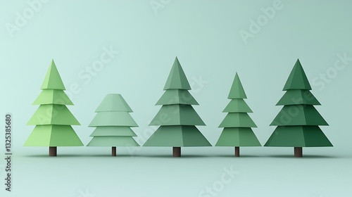 Five Low-Poly Evergreen Trees in Gradient Green Hues Against a Mint Background