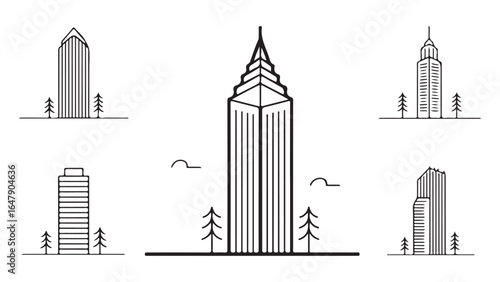 Five minimalist black line art building icons with trees and abstract shapes architecture skyscraper