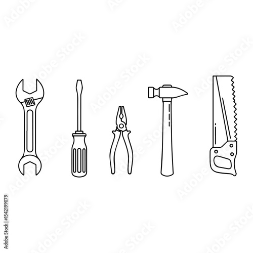 Five outlined tools wrench screwdriver pliers hammer and saw arranged in a row