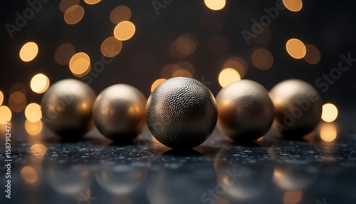 Five patterned copper spheres on dark velvet, amber bokeh, vintage, marbles on table, created with generative ai