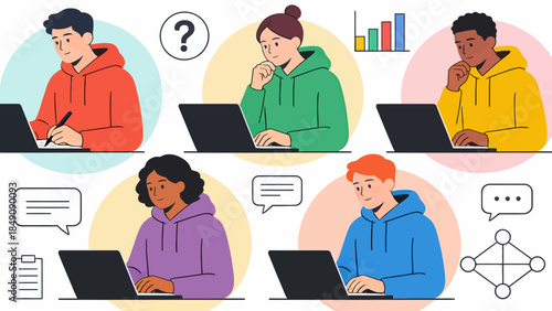 Five people working on laptops