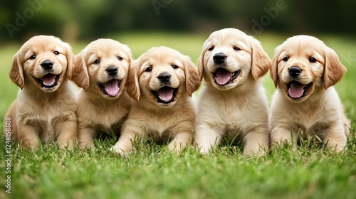 Five Playful Golden Retriever Puppies Sitting Together Outdoors