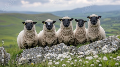 Five sheep sit on a stone wall, overlooking a verdant valley.
