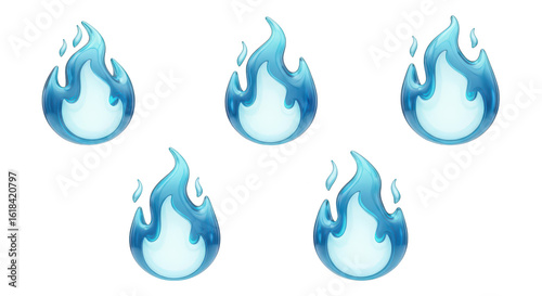 Five stylized blue flames in various sizes against a clean white background suitable for fantasy artwork or digital design elements