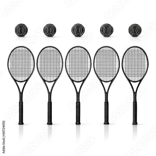 Five tennis rackets and five tennis balls arranged in a row