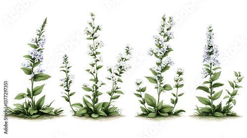 Five Variations of Pale Blue and White Flowering Plants Digitally Rendered
