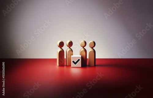 Five wooden figurines stand in front of a white check mark on a white cube against a red and white background.