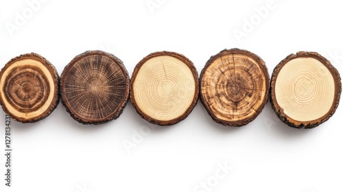 Five Wooden Slices on White Background Natural Wood Texture and Organic Shapes