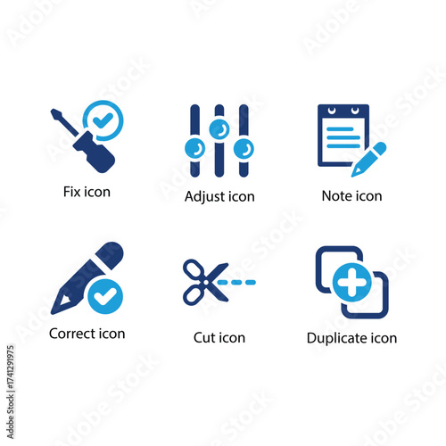 Fix, Adjust, Note, Correct, Cut, Duplicate, Blue Icon Set