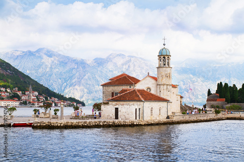 Fjord in Adriatic Sea. Our Lady of the Rock island and Church in Perast on shore of Boka Kotor bay (Boka Kotorska), Montenegro, Europe. Kotor Bay is a UNESCO World Heritage Site