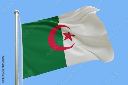 Flag of Algeria On Flagpole Waving in the Wind. Isolated On Blue Sky Background. 3D Rendering.
