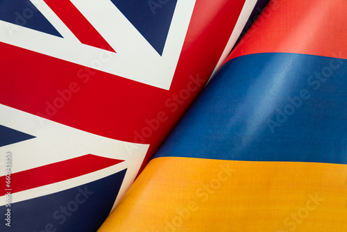 Flags of great britain, armenia. The concept of international relations between countries. The concept of an alliance or a confrontation between two state governments. Friendship of peoples.