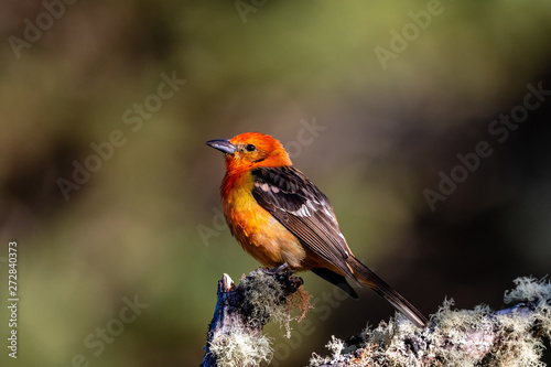Flame-colored tanager Piranga bidentata, adult male perched on a moss covered stump, Costa Rica, February 2019