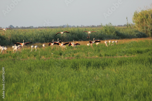 flamencos volando y en un humedal del delta del ebro