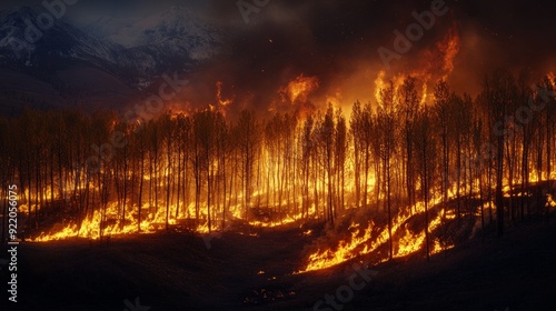 Flames engulfing a forest amidst mountainous terrain at dusk