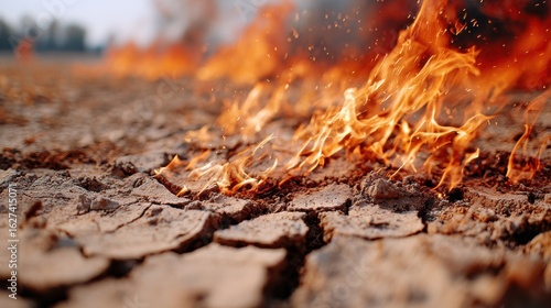 Flames engulfing dry, cracked earth, close-up view of fire on arid ground.