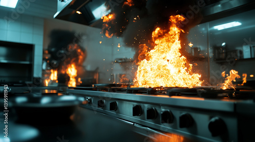 Flames shoot upward from a stove in a professional stainless-steel kitchen, while black smoke rolls across the ceiling. A chaotic safety hazard unfolds, reflecting the reality of k