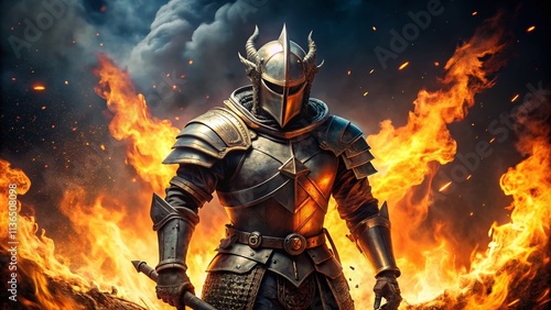 Flaming Armored Warrior, Powerful Knight, Burning Battle, Fiery Soldier, Epic Fantasy Art