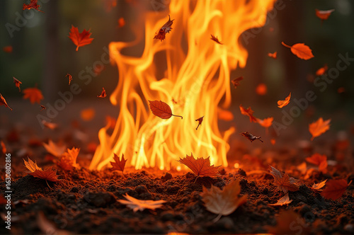 flaming autumn leaves rise amidst blazing fire against forest background, symbolizing change and transformation. seasonal nature poster