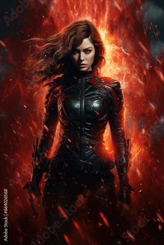 flaming red fantasy background. stern woman with long brown hair. black latex suit. sexy, seductive. Superhero, antihero, superpowers, hero, villain, rogue, fantasy action pose fiction costume.