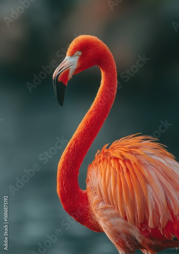 Flamingo with pink and orange feathers stands against a blurred blue background.