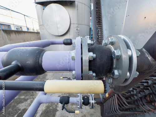 Flanges and ball valves with vibration rubbery damper. Rubbery silenter in pipeline of cooling system.