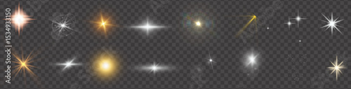 Flash light on black background. Vector glow sparkle effect. Abstract lens flare ignition. Flashing lights