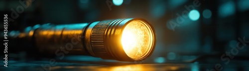 Flashlight shining in a dark workspace, with focused light and shadows, Mysterious, Cool Tones, Detailed