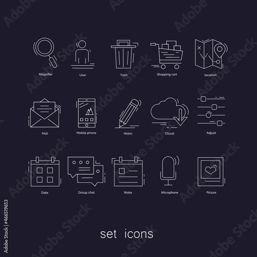 Flat design icons for Website. Symbol development services, social media marketing, business company. Magnifier, User, Trash, Shopping cart, location, mail, mobile phone, notes, cloud, adjust,