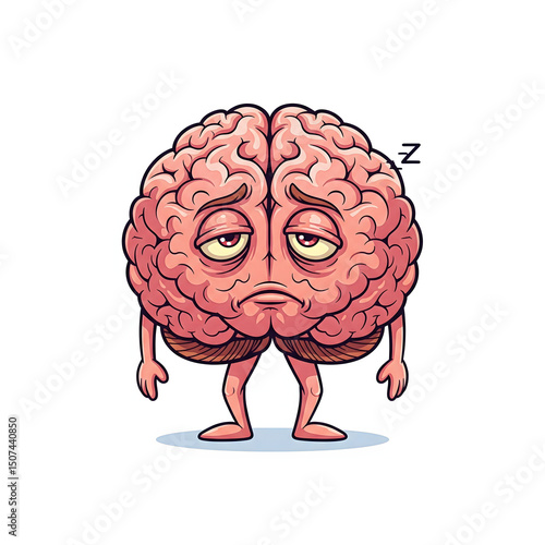 Flat 2D vector of brain character falling asleep while standing, droopy face, weak stance, centered on white background, high detail