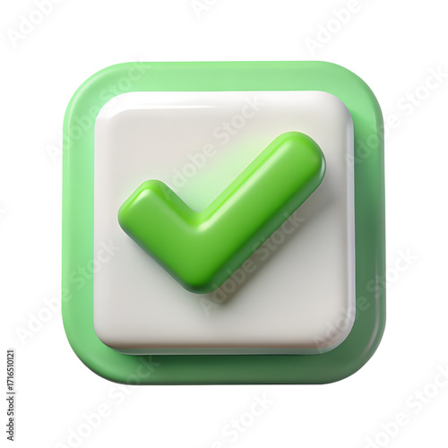 Flat 3D Icon of Green Check Mark Inside White Square Box for Approval, Confirmation, Success, and Task Completion Design