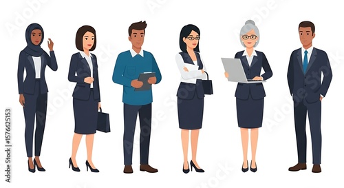 Flat cartoon illustration of diverse businesspeople in formal attire, isolated on white background.