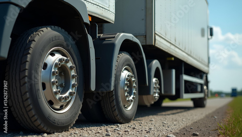 Flat Close up of trucks wheel on gravel road highlighting vehicles robust design and surrounding environment concept as Close up of trucks wheel on gravel road highlighting vehicles robust design and