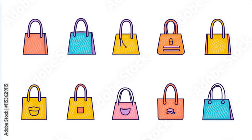Flat color cute simple minimalist shopping bag icons set, isolated on a white background
